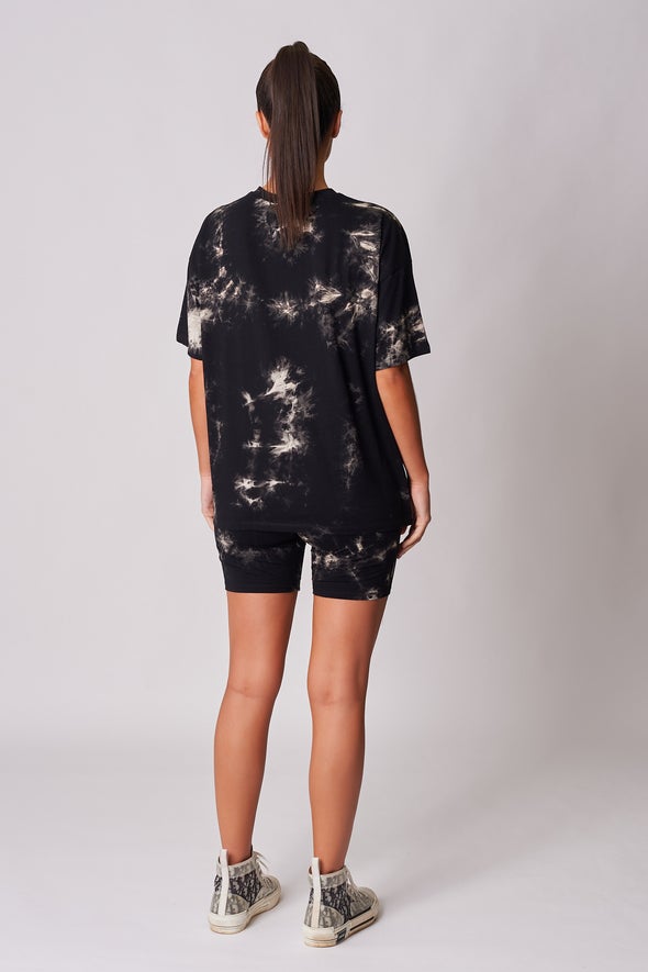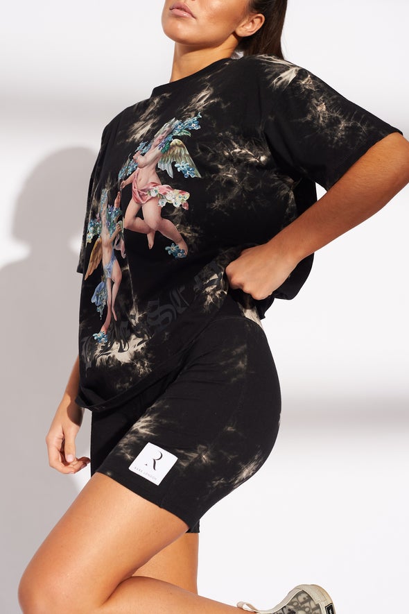 Squat proof verified. Tie dye? It's a must have. Introducing our black based cycling shorts featuring tie dye. Style with our matching embellished cherub t-shirt for the ultimate co-ord look.