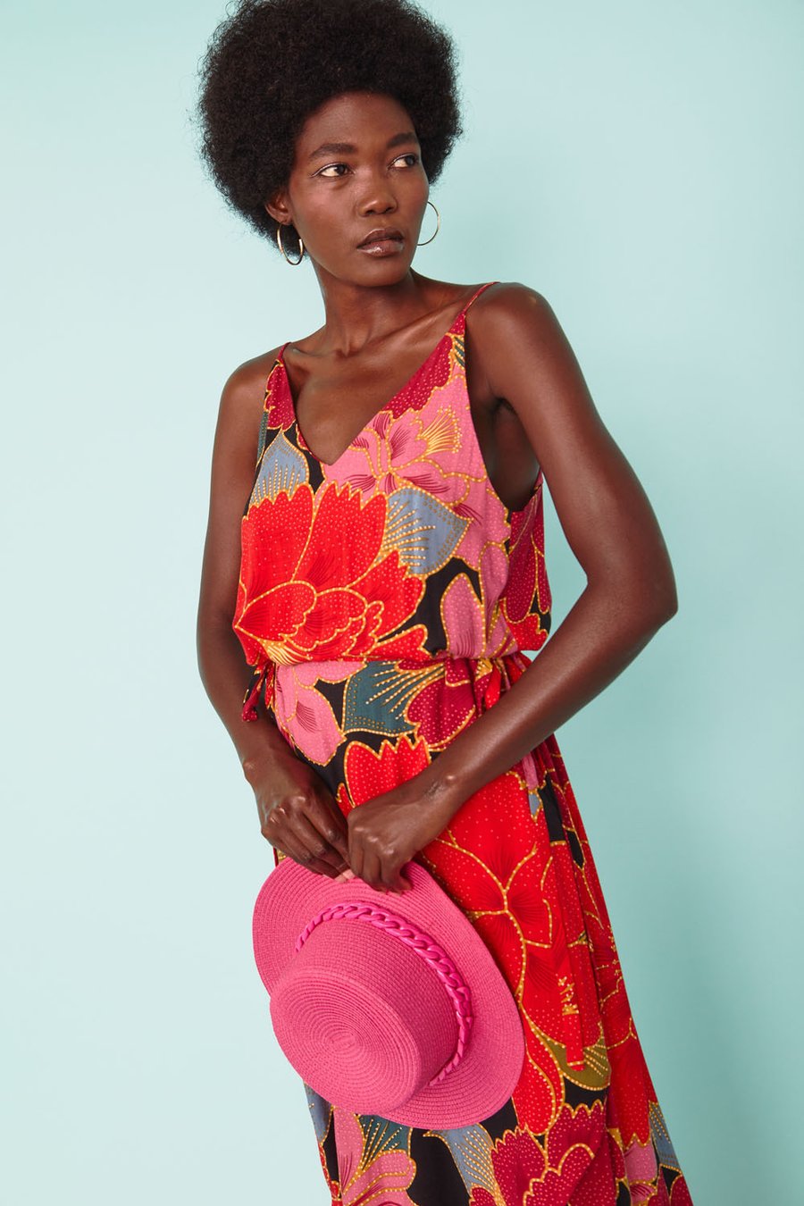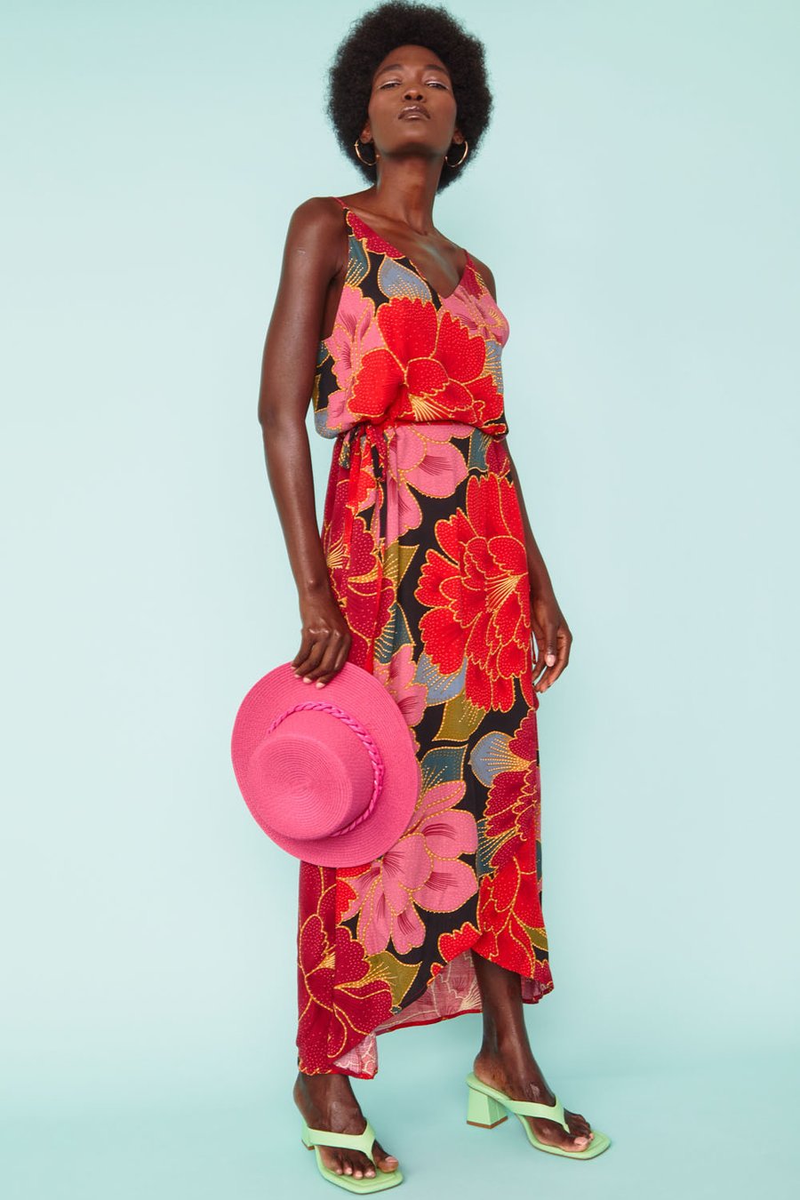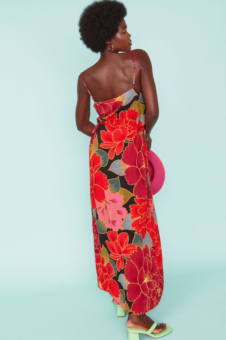 Brighten up your day with this tropical flower design linen blend pint maxi dress. This dress has a classic silhouette and features adjustable straps, a drawstring waist with side ties and a crossover skirt that creates a beautiful hemline.